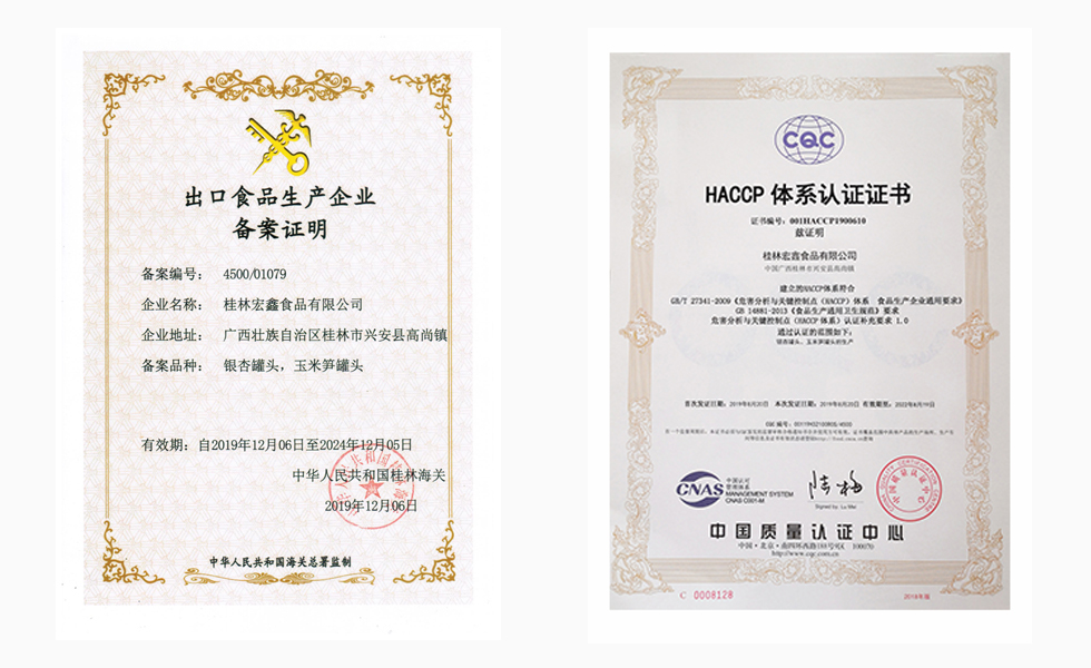 桂林宏鑫食品有限公司,從2002年開始,專注于銀杏罐頭、白果罐頭、真空包裝白果仁等產(chǎn)品的加工和出口。公司通過出口食品生產(chǎn)企業(yè)備案,獲得HACCP體系認證,具備進口貿(mào)易資質(zhì)。